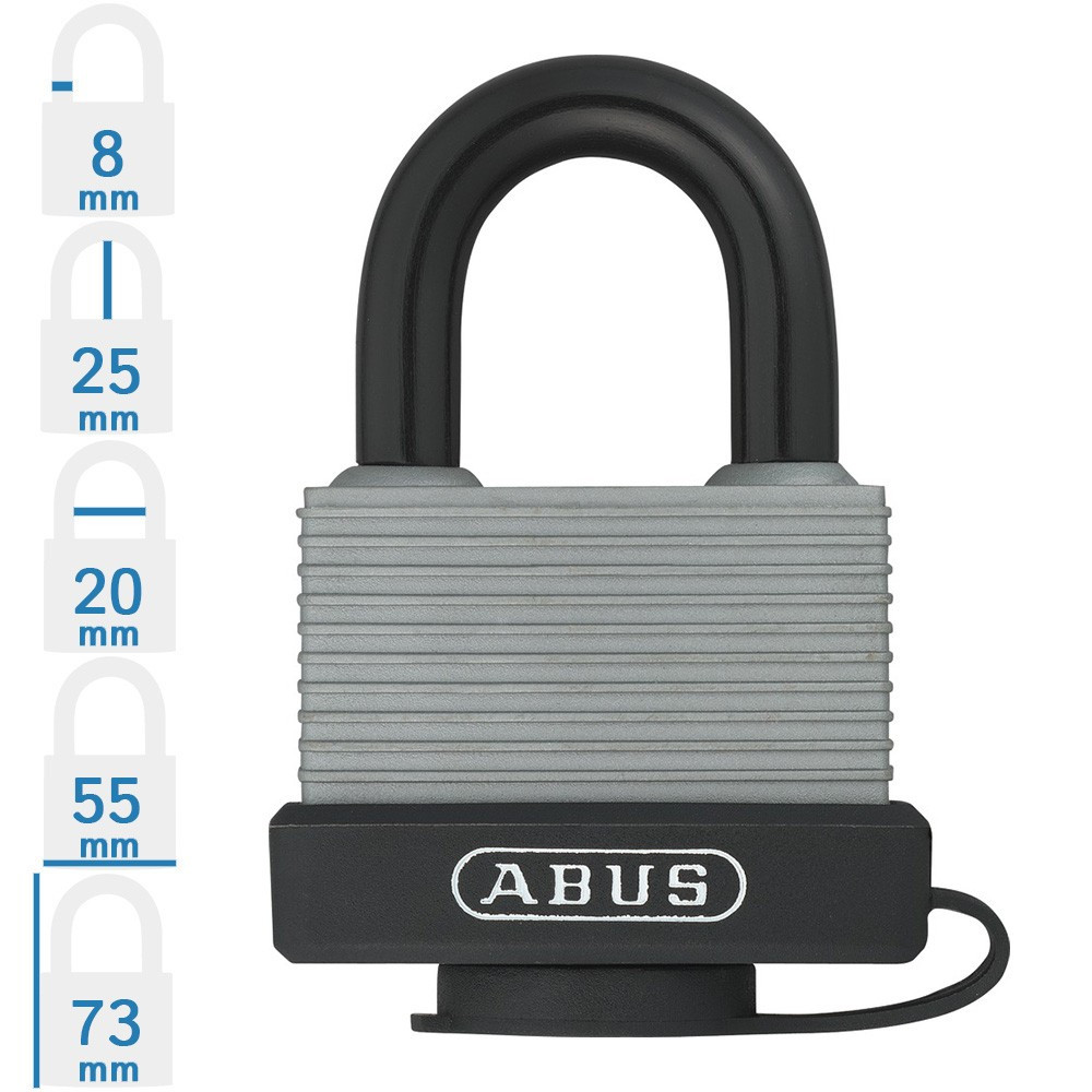 ABUS 717AL/45 kültéri lakat. Fokozott időjárás elleni elleni védelem a műanyag borításnak köszönhetően és a fedett zárnyílás által. Ugrókengyeles kivitel. Precíziós ABUS zárbetét, 2 db kulccsal. Méret: lásd a képen.