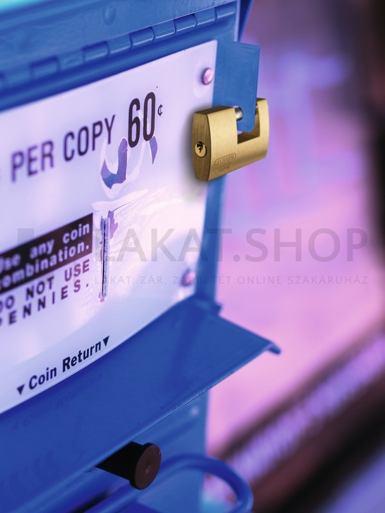 Abus 722/70 réz tömb lakat, másnéven u lakat. Minőségi Abus cilinder, 2 db kulccsal. Masszív réz lakatház; edzett acél kengyel. Kialakításából adódóan ellenállóbb a vágószerszámokkal szemben. A kengyel zárt állapotban is körbeforog, ezáltal megnehezítve a kengyel lefűrészelését. Méret: lásd a képen. Lakat test mélység 20 mm.