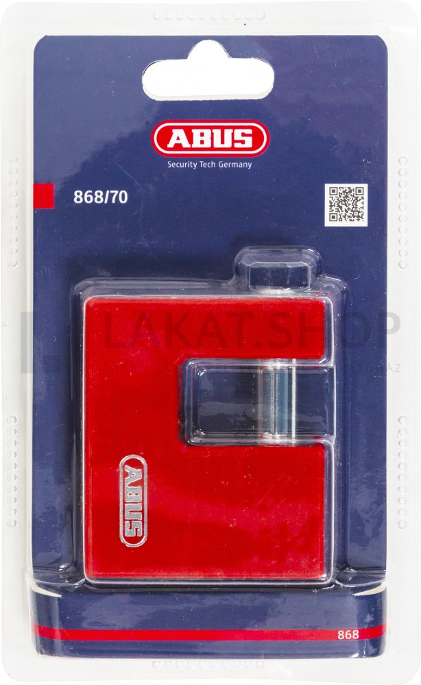 Abus 868/70 tömb vas lakat. Minőségi 6 csapos réz hengerzár, 3 db pontfuratos kulccsal. Masszív vas lakatház, műanyag bevonattal; edzett acél kengyel. Kialakításából adódóan ellenállóbb a vágószerszámokkal szemben. A kengyel zárt állapotban is körbeforog, ezáltal megnehezítve a kengyel lefűrészelését. Lakat test mélység: 20 mm. Súly: 450g.