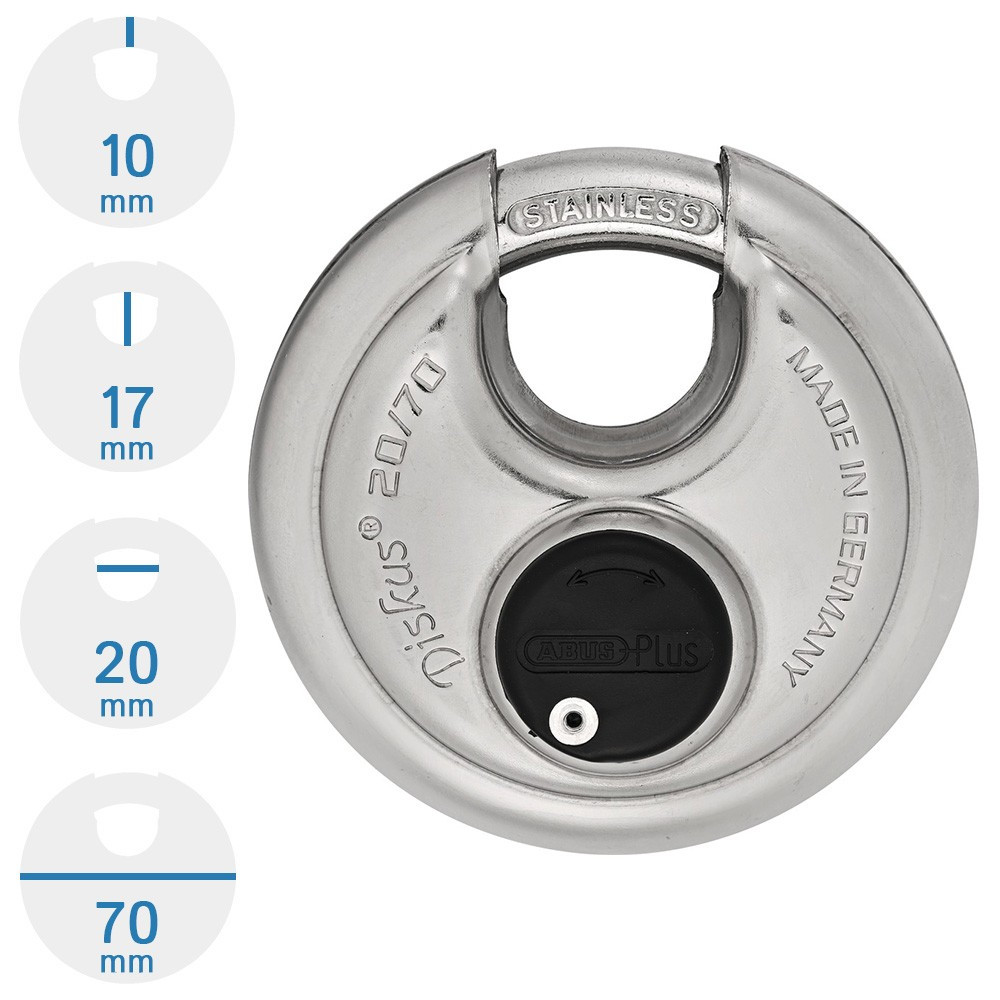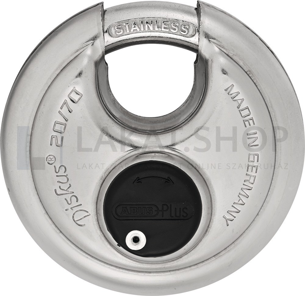 Abus Diskus 20/70 KA biztonsági lakat. Minőségi Abus Plus lamellás zárbetét, 2 db kulccsal. Masszív lakatház; edzett acél kengyel. Lényegében zárt kivitele által ellenállóbb a vágószerszámokkal szemben. Lakat test mélység: 30,5 mm.
