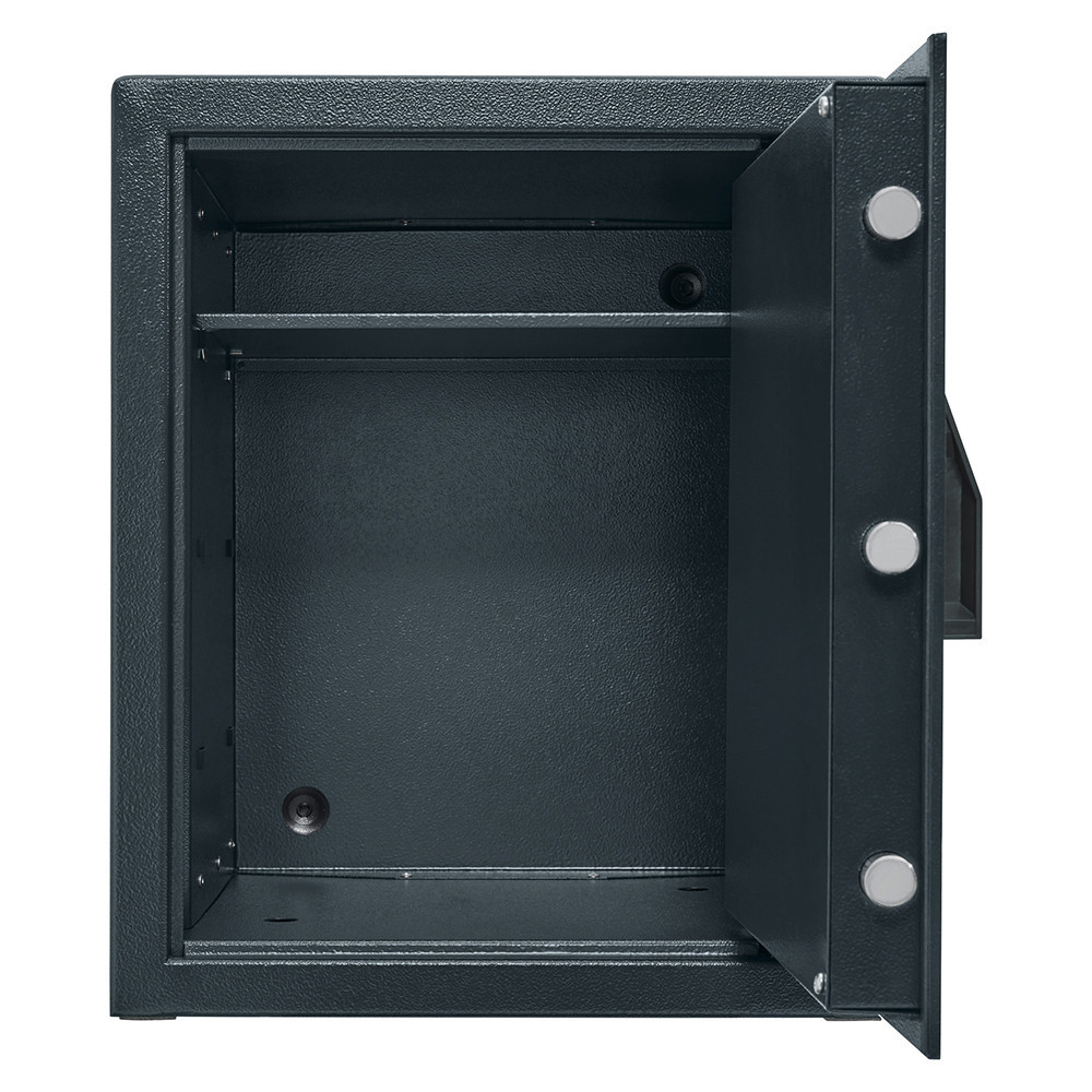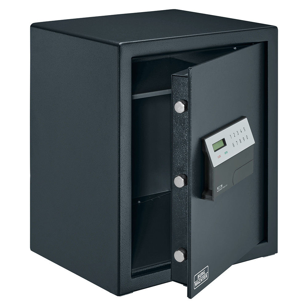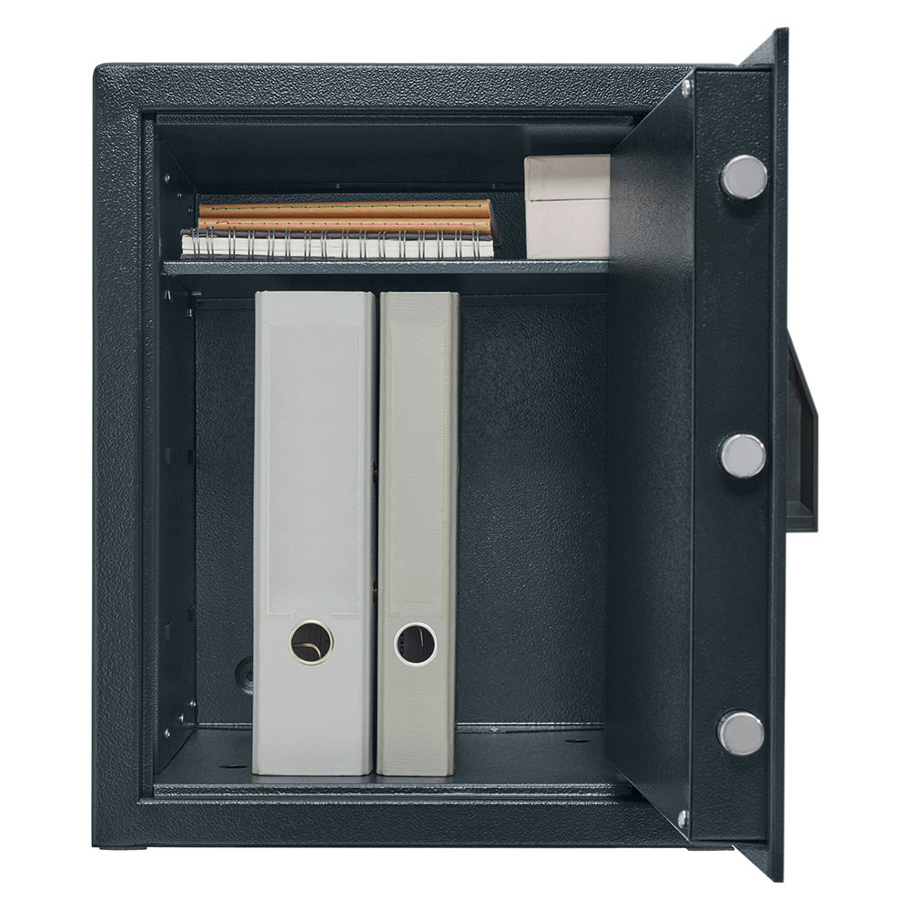 •DIN 4102-A1 szerinti tűzálló szigetelés•duplafalú bútorszéf otthonába, irodájába•40 mm vastag duplafalú acél test•46 mm vastag ajtó, 6 mm-es acél borítással•90 fokos ajtónyitás jobboldali zsanérokkal•egyirányú zárás 22 mm átmérőjű acél hevederekkel•SecuTronic elektronikus számkombinációs zár•kopásálló érintőgombok, külső elemtartó•nagyméretű LCD kijelző segíti a használatot•1 db adminisztrátori kód és 1 db felhasználó kód kezelése•könnyan programozható 6 számjegyű kódok•zár 4 db Mignon LR6 AA elemmel működik•mechanikus vésznyitási lehetőség tűkulccsal•billentyűzet 19 mm-re emelkedik ki az ajtó síkjából•praktikus iratrendező mélység•kivehető, állítható magasságú polc•10 mm-es rögzítő furat lefelé és hátrafelé•Burg Wachter FB 500 tűzvédelmi tasakkal kombinálva akár 15 perc tűzvédelmet biztosít papírdokumentumok számára, 700C hőmérsékletig (Burg Wachter laborban tesztelve)•rögzítő csomaggal, fekete színben áruljuk