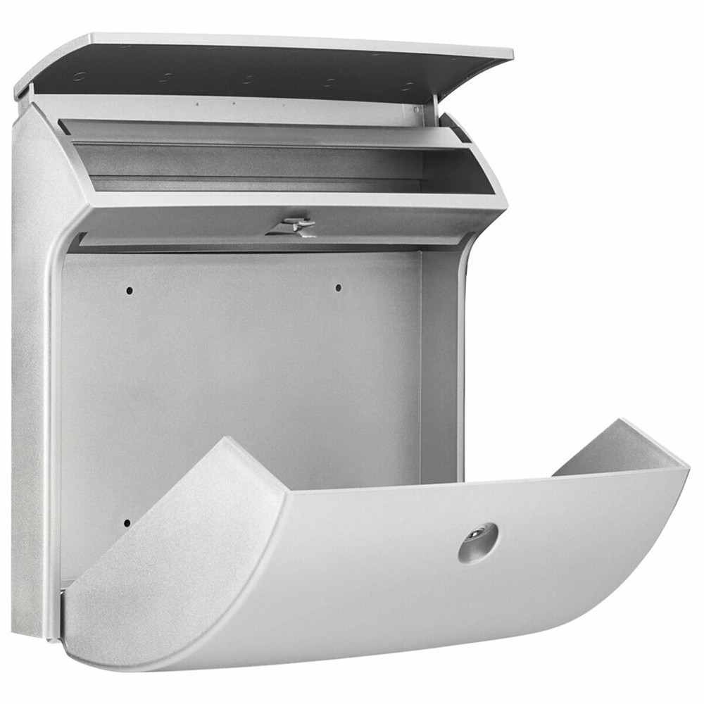 • kapun, kerítésen kívülre szerelhető postaláda• anyaga masszív UV álló műanyag• extrém időjárásálló kivitel• lágy vonalvezetésű kültéri postaláda• felső bedobónyílás felhajtható tetővel• biztonságos ürítés érdekében nyitáshatárolóval ellátott lefelé nyíló ajtóval• EN 13724 szabványnak megfelelő levélszekrény• krómozott postaláda zár• kettő darab kulccsal• fehér vagy ezüst színben• rögzítő csavarokkal