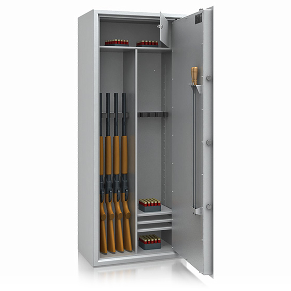 • 40 mm vastag, duplafalú acél test• 50 mm vastag, duplafalú ajtó, 3 mm-es acél borítással• 90 fokos ajtónyitás, erősített belső zsanérokkal• háromirányú zárás, 20 mm-es kerek, acél hevederekkel• felfúrás ellen mangán acéllappal védett zárszerkezet• 200 mm magas külön zárható lőszertartó cilinderzárral, kettő darab kulccsal• szivacs fegyvertartók 2, 4 vagy 5 db fegyver részére• 3 db állítható magasságú polc a szekrény jobb oldalán• ajtóra szerelt tisztítóvessző tartó• két darab 10mm-es rögzítő furat lefelé és hátrafelé• zöld (RAL 6020) vagy szürke (RAL 7035) színben