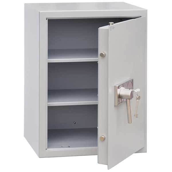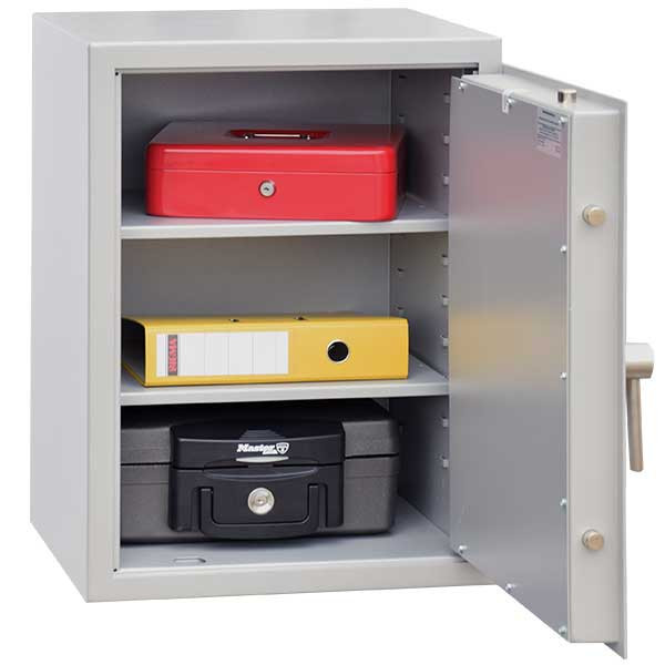 •40 mm vastag, duplafalú acél test•50 mm vastag, duplafalú ajtó, 3 mm-es acél borítással•90 fokos ajtónyitás rejtett zsanérokkal•háromirányú zárás, 20 mm-es kerek, acél hevederekkel•felfúrás ellen mangán acéllappal védett zárszerkezet•duplatollú kulcsos zár, 2 db 95 mm-es kulccsal•finomnyitás elleni védelem•krómozott fém kilincs•2 db állítható magasságú polcok•10 mm-es rögzítő furat hátrafelé és lefelé•alumíniumszürke szín