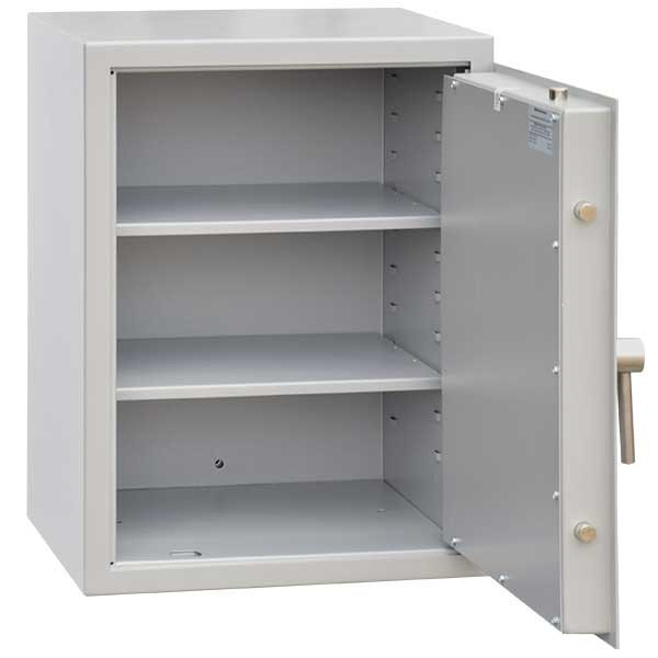 • 40 mm vastag, duplafalú acél test • 50 mm vastag, duplafalú ajtó, 3 mm-es acél borítással • 90 fokos ajtónyitás rejtett zsanérokkal • háromirányú zárás, 20 mm-es kerek, acél hevederekkel • felfúrás ellen mangán acéllappal védett zárszerkezet • duplatollú kulcsos zár, 2 db 95 mm-es kulccsal • finomnyitás elleni védelem • krómozott fém kilincs • 2 db állítható magasságú polcok • 10 mm-es rögzítő furat hátrafelé és lefelé • alumíniumszürke szín • biztosítási értékhatár: 2 500 000 Ft, riasztórendszerbe kötve: 5 000 000 Ft