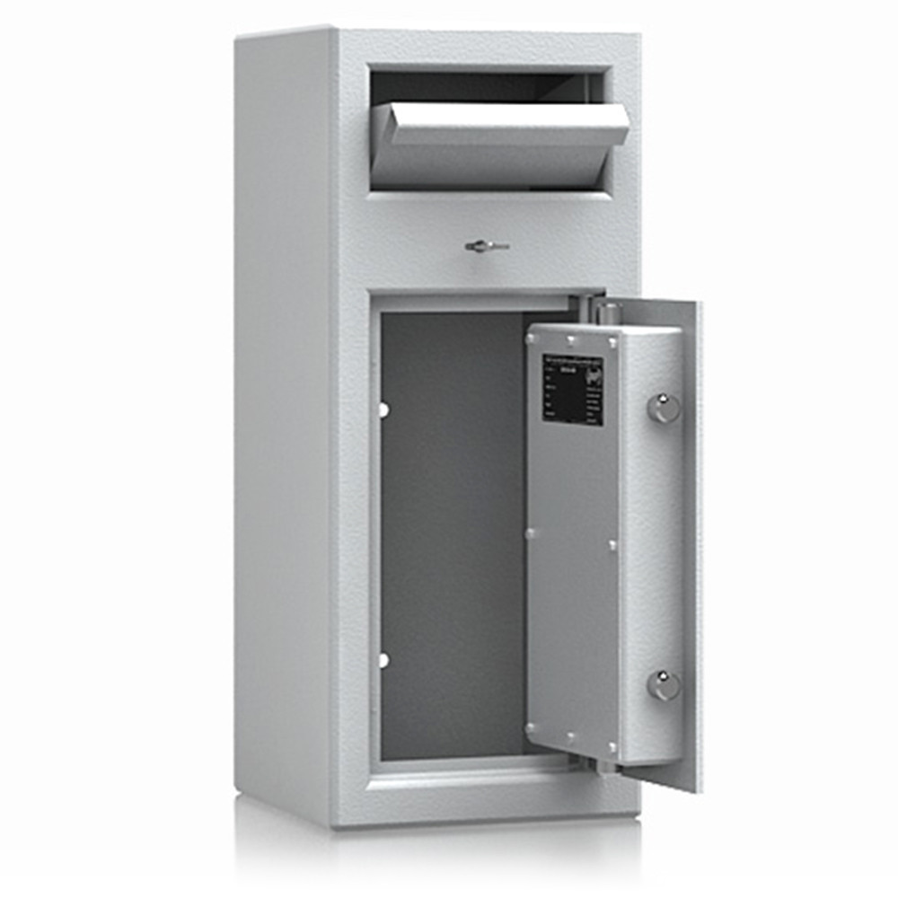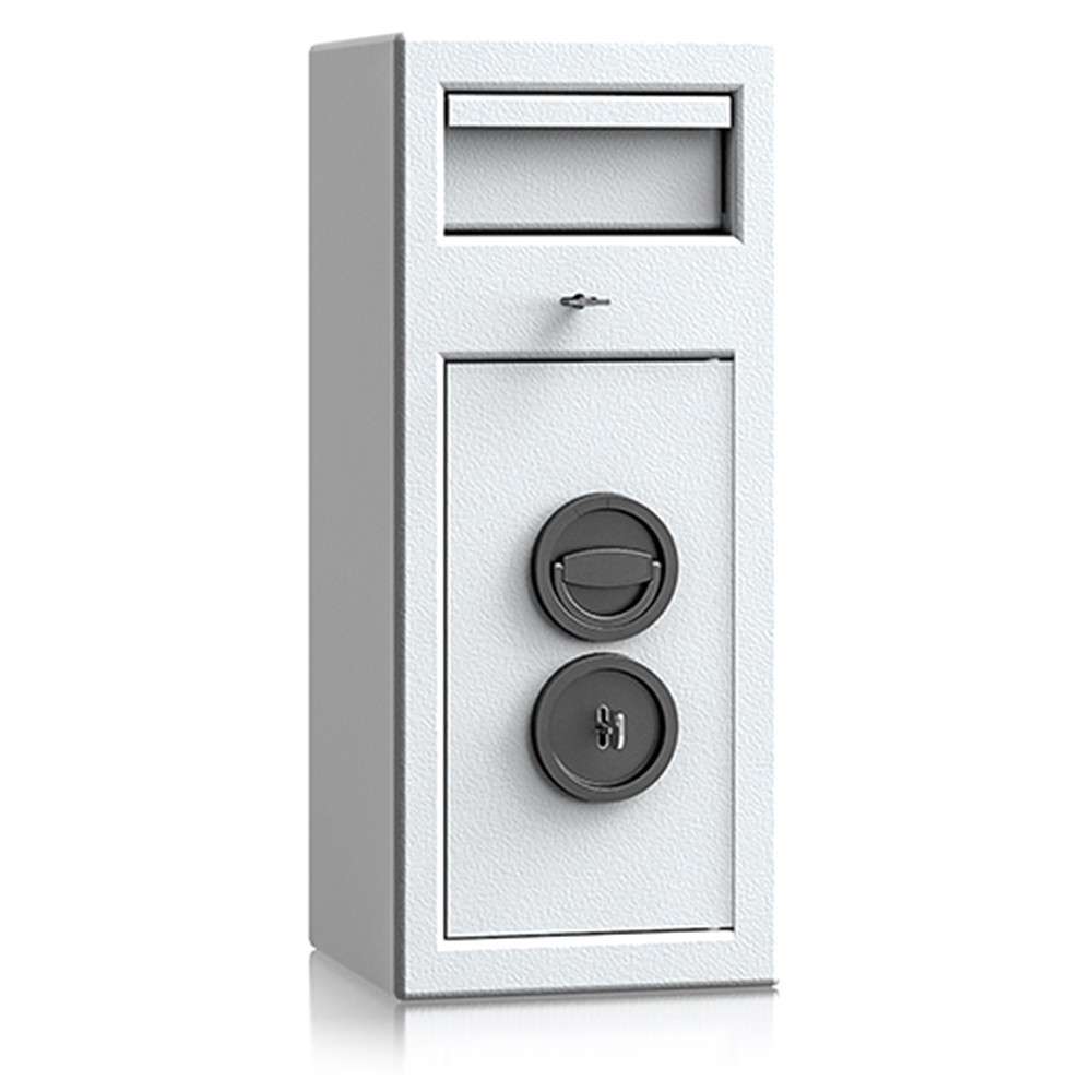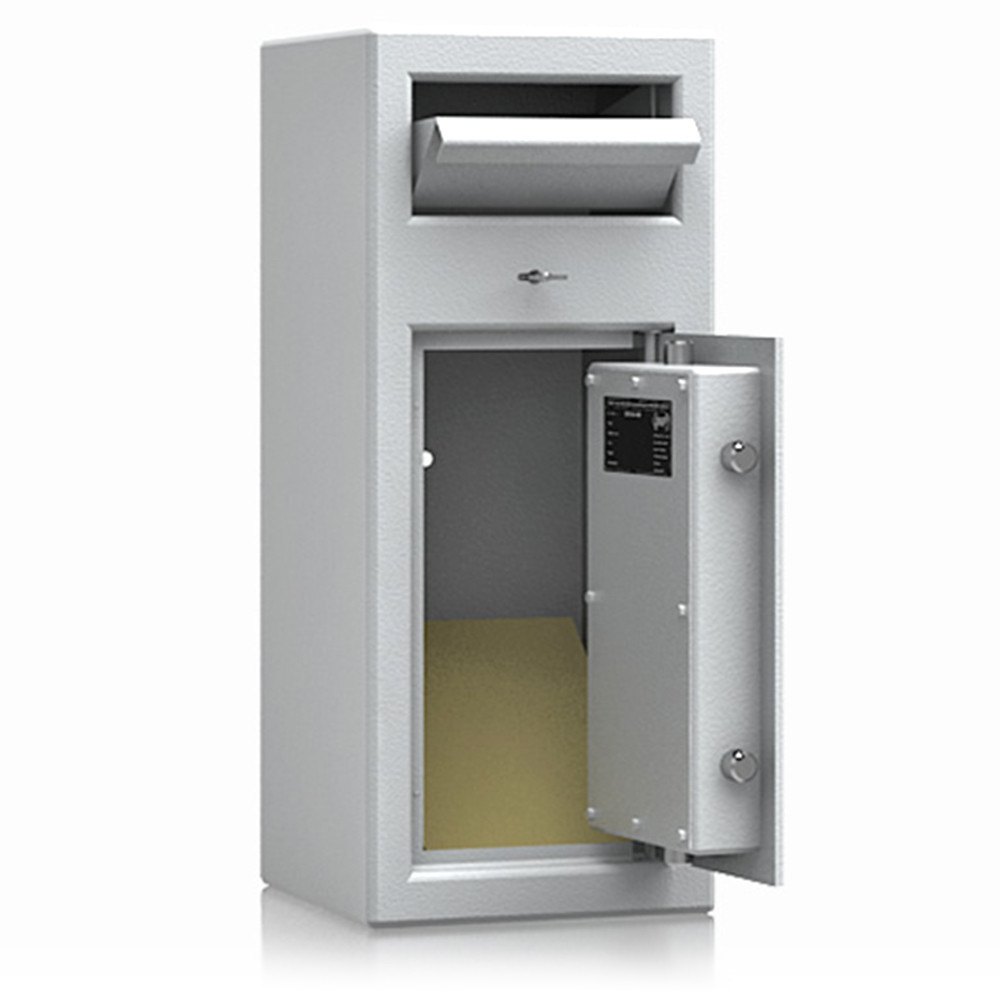 •lefelé nyíló csúszdás bedobó szerkezet•bedobó nyílás külön zárható (2 db kulccsal)•maximális kihalászás elleni védelem•3 mm vastag egyfalú acél test•52 mm vastag duplafalú ajtó, 6 mm-es acél borítással•90 fokban jobbra nyíló ajtó, belső zsanérokkal•háromirányú zárás, kerek acél hevederekkel•felfúrás ellen mangán acéllappal védett zárszerkezet•alapkivitelben duplatollú kulcsos zárral, 2 db kulccsal•felár ellenében más zárral is rendelhető•12 mm-t kiálló fém fogantyú•rögzítő furatok lefelé és hátrafelé