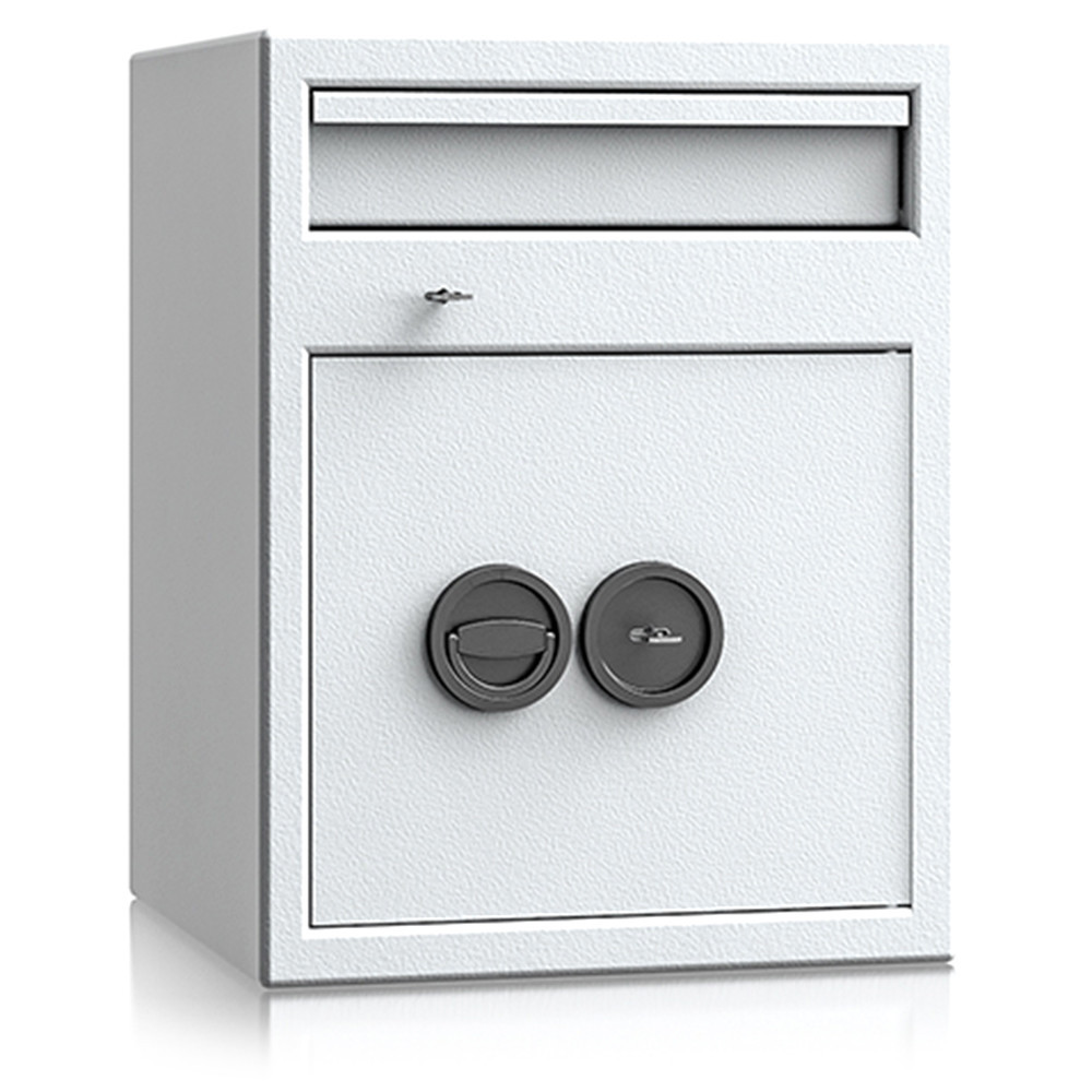 • lefelé nyíló csúszdás bedobó szerkezet • bedobó nyílás külön zárható (2 db kulccsal) • maximális kihalászás elleni védelem • 3 mm vastag egyfalú acél test • 52 mm vastag duplafalú ajtó, 6 mm-es acél borítással • 90 fokban jobbra nyíló ajtó, belső zsanérokkal • háromirányú zárás, kerek acél hevederekkel • felfúrás ellen mangán acéllappal védett zárszerkezet • alapkivitelben duplatollú kulcsos zárral, 2 db kulccsal • felár ellenében más zárral is rendelhető • 12 mm-t kiálló fém fogantyú • rögzítő furatok lefelé és hátrafelé • biztosítási értékhatár: 1 500 000 Ft, riasztórendszerbe kötve: 3 000 000 Ft