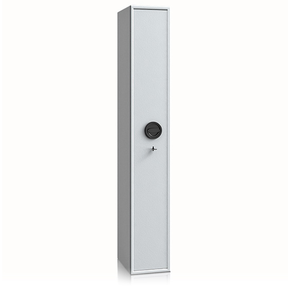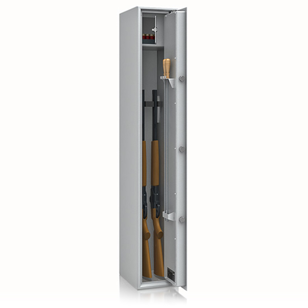 • 3 mm-es, szimplafalú acél test• 55 mm vastag, duplafalú ajtó, 3 mm-es acél borítással• 90 fokos ajtónyitás, erősített belső zsanérokkal• háromirányú zárás, 25 mm-es kerek, acél hevederekkel• felfúrás ellen mangán acéllappal védett zárszerkezet• külön zárható lőszertartó, 3 mm-es acél ajtóval, cilinderzárral, kettő darab kulccsal (200 mm magas, 240 mm mély)• szivacs fegyvertartók 3, 5 vagy 7 db fegyver részére• ajtóra szerelt tisztítóvessző tartó• két darab 10mm-es rögzítő furat lefelé és hátrafelé• zöld (RAL 6020) vagy szürke (RAL 7035) színben