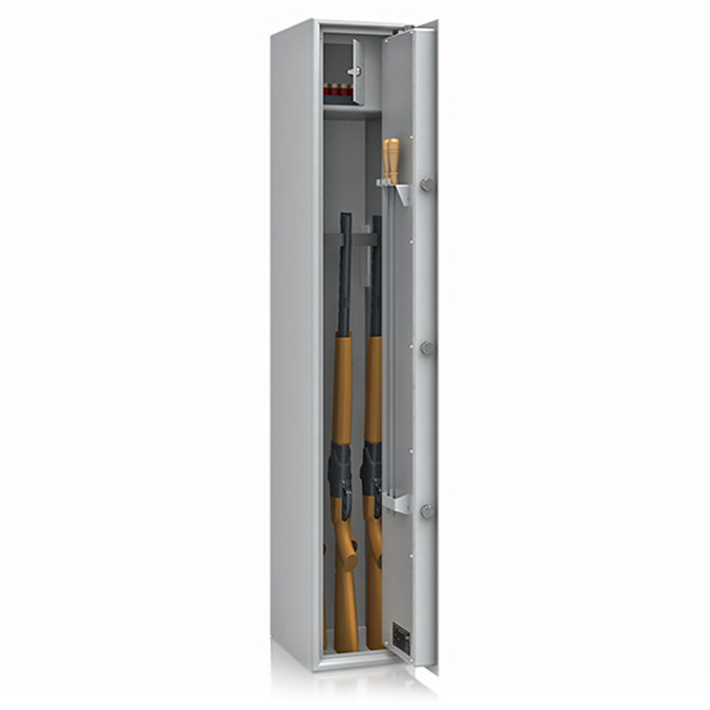• 3 mm-es, szimplafalú acél test• 55 mm vastag, duplafalú ajtó, 3 mm-es acél borítással• 90 fokos ajtónyitás, erősített belső zsanérokkal• háromirányú zárás, 25 mm-es kerek, acél hevederekkel• felfúrás ellen mangán acéllappal védett zárszerkezet• külön zárható lőszertartó, 3 mm-es acél ajtóval, cilinderzárral, kettő darab kulccsal (200 mm magas, 240 mm mély)• szivacs fegyvertartók 3, 5 vagy 7 db fegyver részére• ajtóra szerelt tisztítóvessző tartó• két darab 10mm-es rögzítő furat lefelé és hátrafelé• zöld (RAL 6020) vagy szürke (RAL 7035) színben