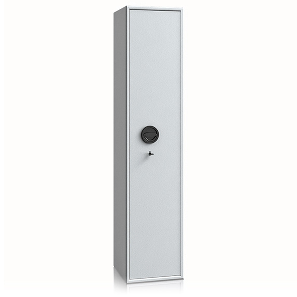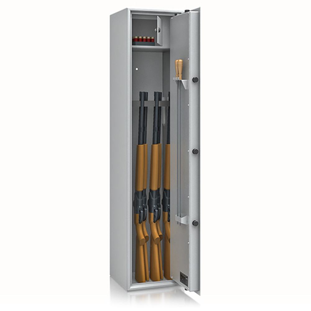 • 3 mm-es, szimplafalú acél test• 55 mm vastag, duplafalú ajtó, 3 mm-es acél borítással• 90 fokos ajtónyitás, erősített belső zsanérokkal• háromirányú zárás, 25 mm-es kerek, acél hevederekkel• felfúrás ellen mangán acéllappal védett zárszerkezet• külön zárható lőszertartó, 3 mm-es acél ajtóval, cilinderzárral, kettő darab kulccsal (200 mm magas, 240 mm mély)• szivacs fegyvertartók 3, 5 vagy 7 db fegyver részére• ajtóra szerelt tisztítóvessző tartó• két darab 10mm-es rögzítő furat lefelé és hátrafelé• zöld (RAL 6020) vagy szürke (RAL 7035) színben