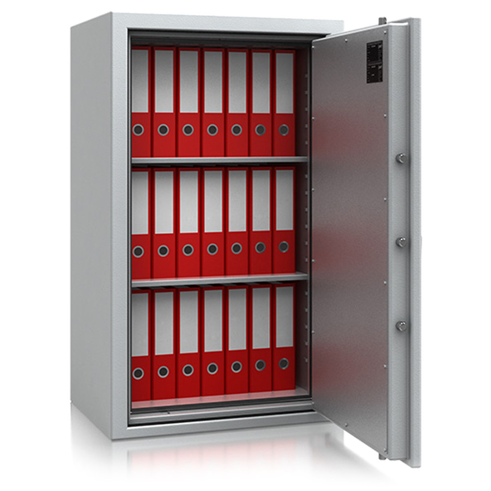 • 30 perces tűzállóság dokumentumok részére• 840C-on a belső hőmérséklet 150C alatt marad• duplafalú acél test, speciális hőszigetelő töltettel• 78 mm vastag, duplafalú acél ajtó, speciális töltettel• speciális füst,- és vízszigetelő tömítés az ajtóban• 180 fokos ajtónyitás a külső zsanéroknak köszönhetően• háromirányú zárás, 25 mm-es kerek, acél hevederekkel• erős rögzítő fülek a zsanéroldalon• felfúrás ellen mangán acéllappal védett zárszerkezet• Vaihingen 9 és 10 duplaszárnyú ajtóval készül• állítható magasságú polcok• rögzítő furat lefelé• világosszürke (RAL 7035) szín