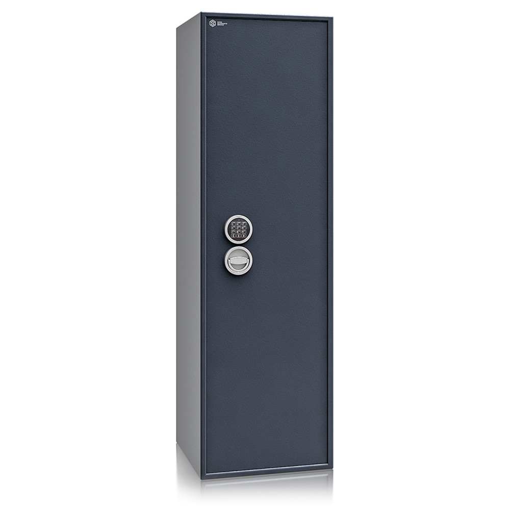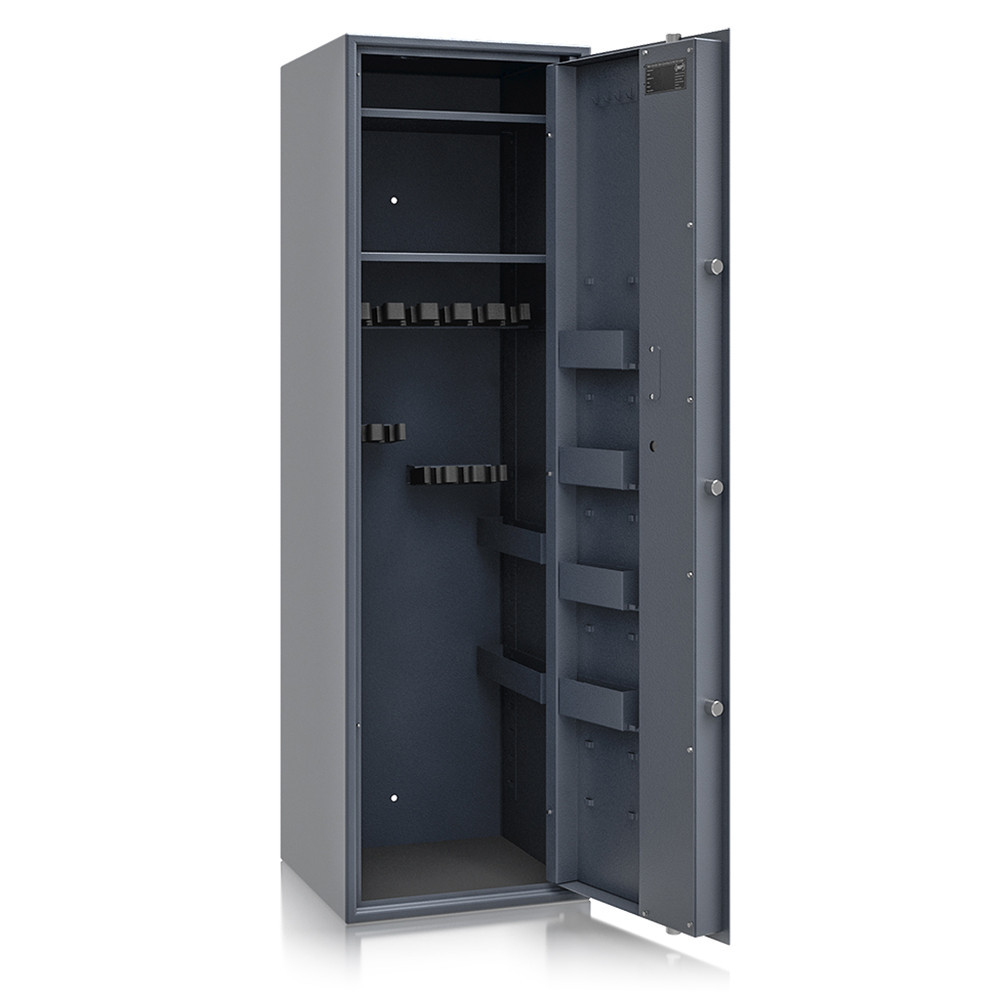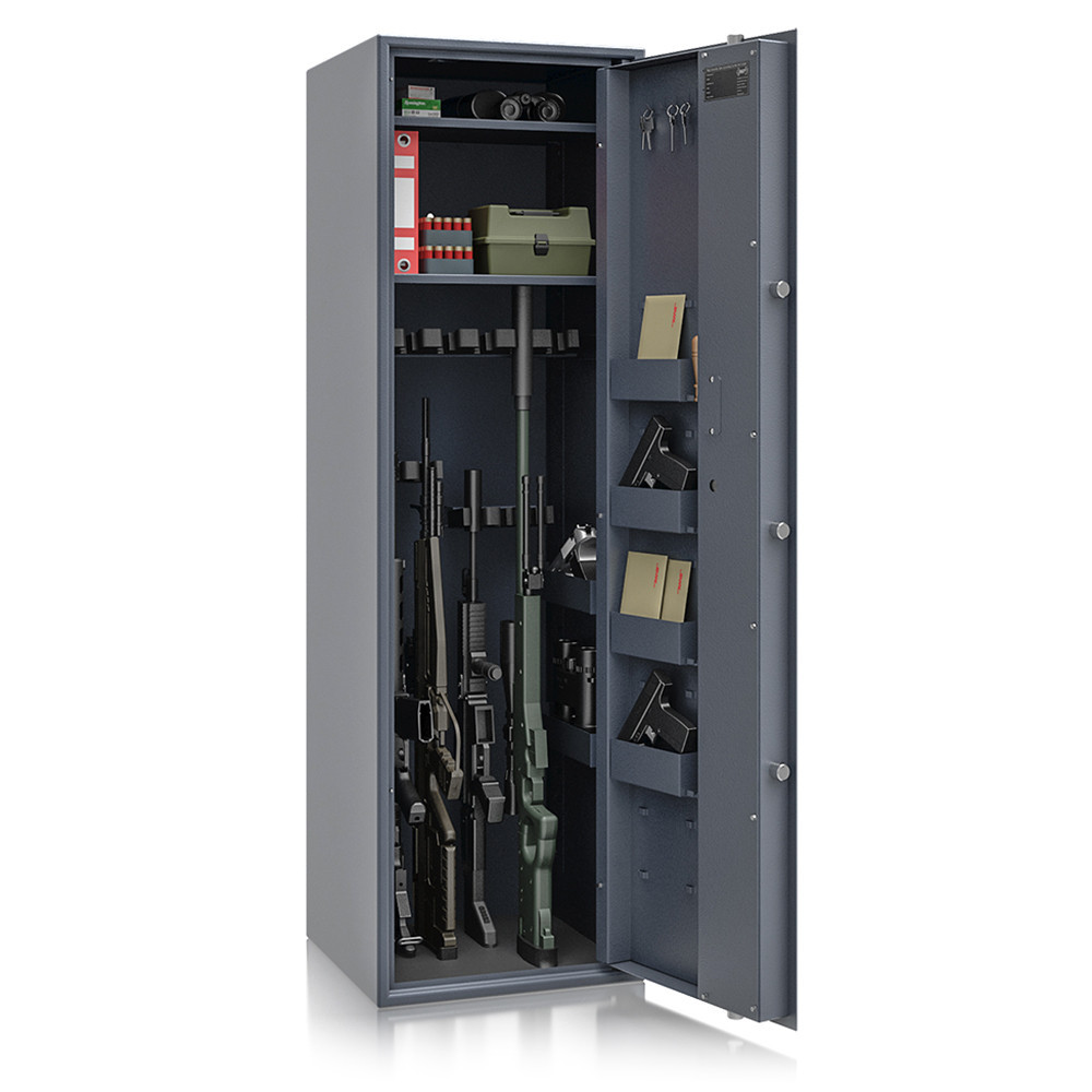 •minőségi fegyverszekrény•beépített lőszertartó nélkül•3 mm vastag, egyfalú acél test•60 mm vastag duplafalú ajtó, 3 mm-es acél borítással•12 mm-re kiálló, ajtóra simuló fém kilincs •90 fokos ajtónyitás, erősített belső zsanérokkal•háromirányú zárás, 25 mm-es kerek, acél hevederekkel•felfúrás ellen mangán acéllappal védett zárszerkezet•állítható magasságú (mágneses) szivacs fegyvertartók•2 db kivehető és állítható magasságú polc (felül)•2 db kivehető tárolódoboz (jobb oldalon)•4 db állítható magasságú tárolódoboz (ajtón)•1 db kulcsakasztó sín (ajtón, felül)•két darab rögzítő furat lefelé és hátrafelé•alapkivitelben VdS I-es kulcsos zár, 2 db 65 mm-es kulccsal•többféle zárral, grafitszürke (RAL 7024) színben rendelhető