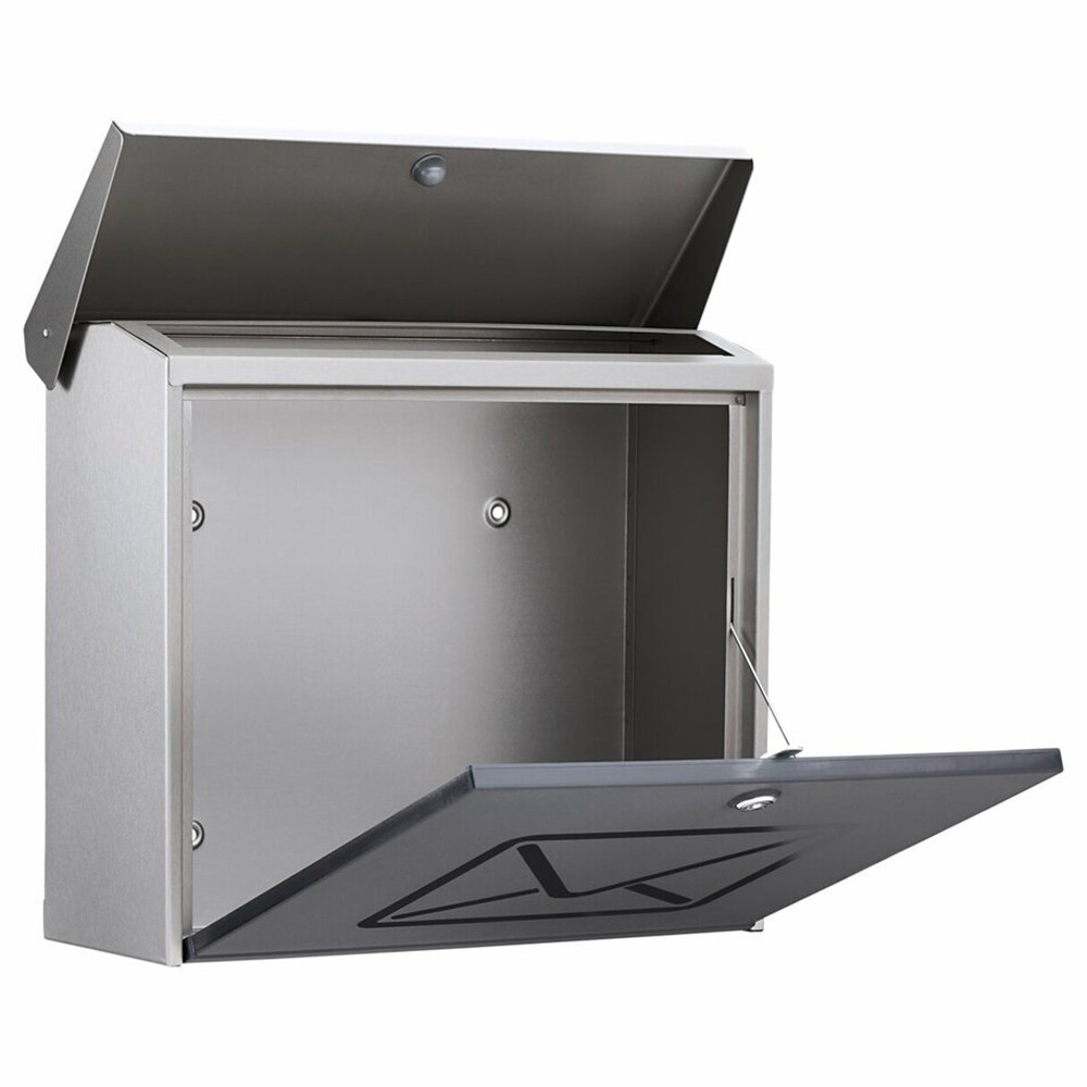 • kapun, kerítésen kívülre szerelhető postaláda • anyaga szálcsiszolt rozsdamentes acéllemez • elegáns megjelenésű áttetsző, kék műanyag ajtó • extrém időjárásálló kivitel • felső bedobónyílás felhajtható tetővel • biztonságos ürítés érdekében nyitáshatárolóval ellátott lefelé nyíló ajtóval • EN 13724 szabványnak megfelelő levélszekrény • nagy befogadóképesség • krómozott postaláda zár • kettő darab kulccsal • rögzítő csavarokkal