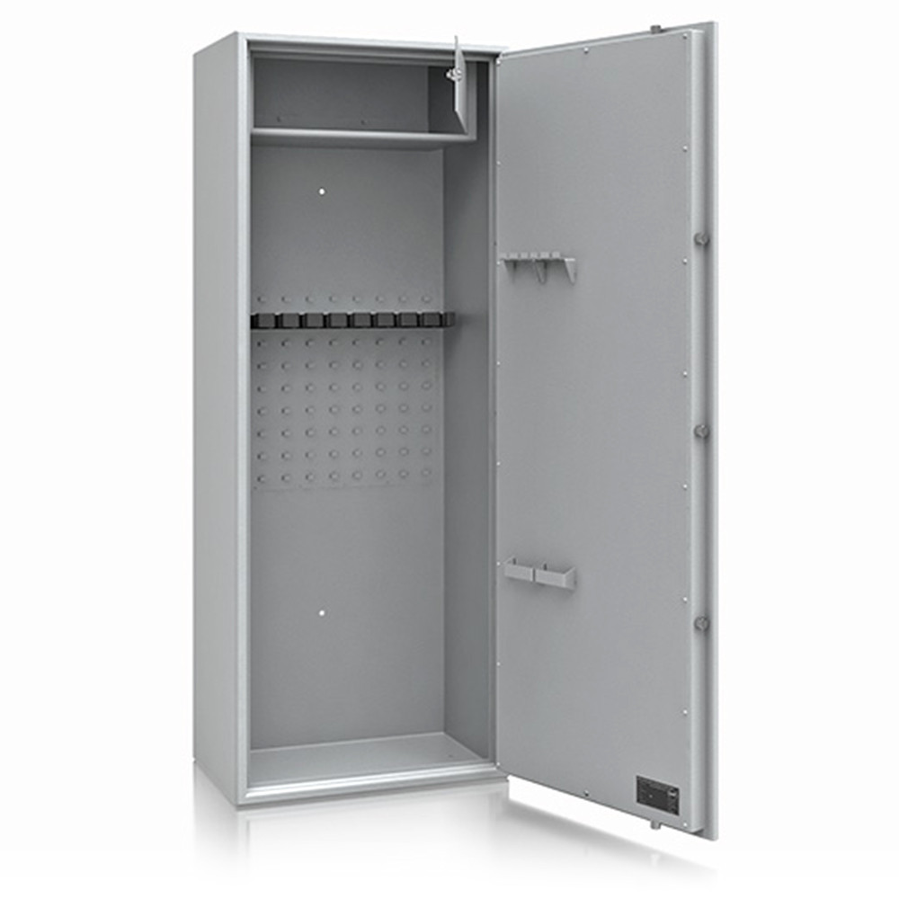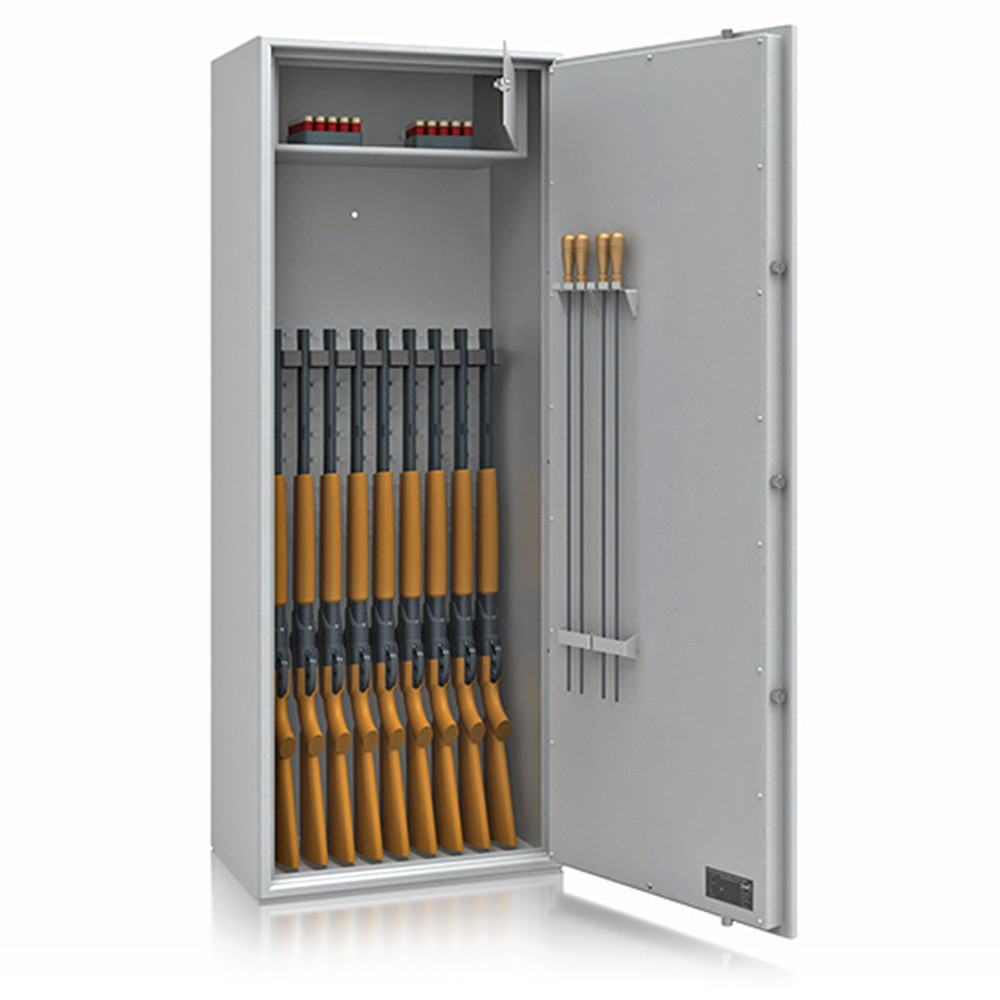 • 3 mm-es, szimplafalú acél test• 60 mm vastag, triplafalú ajtó (20 mm-es erősítéssel)• 180 fokos ajtónyitás, erősített külső zsanérokkal• háromirányú zárás, 20 mm-es kerek, acél hevederekkel• felfúrás ellen mangán acéllappal védett zárszerkezet• külön zárható lőszertartó (lecsavarozható), 3 mm-es acél ajtóval, cilinderzárral, kettő darab kulccsal (180 mm magas, 260 mm mély)• szivacs fegyvertartók 5, 6, 8 vagy 10 db fegyver részére (magassága állítható)• ajtóra szerelt tisztítóvessző tartó• két darab 10mm-es rögzítő furat lefelé és hátrafelé• zöld (RAL 6020) vagy szürke (RAL 7035) színben