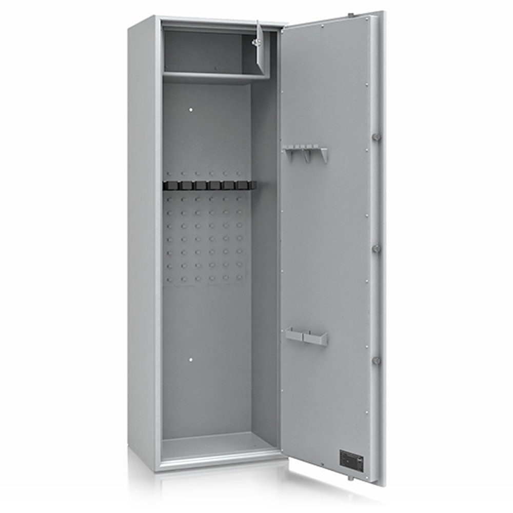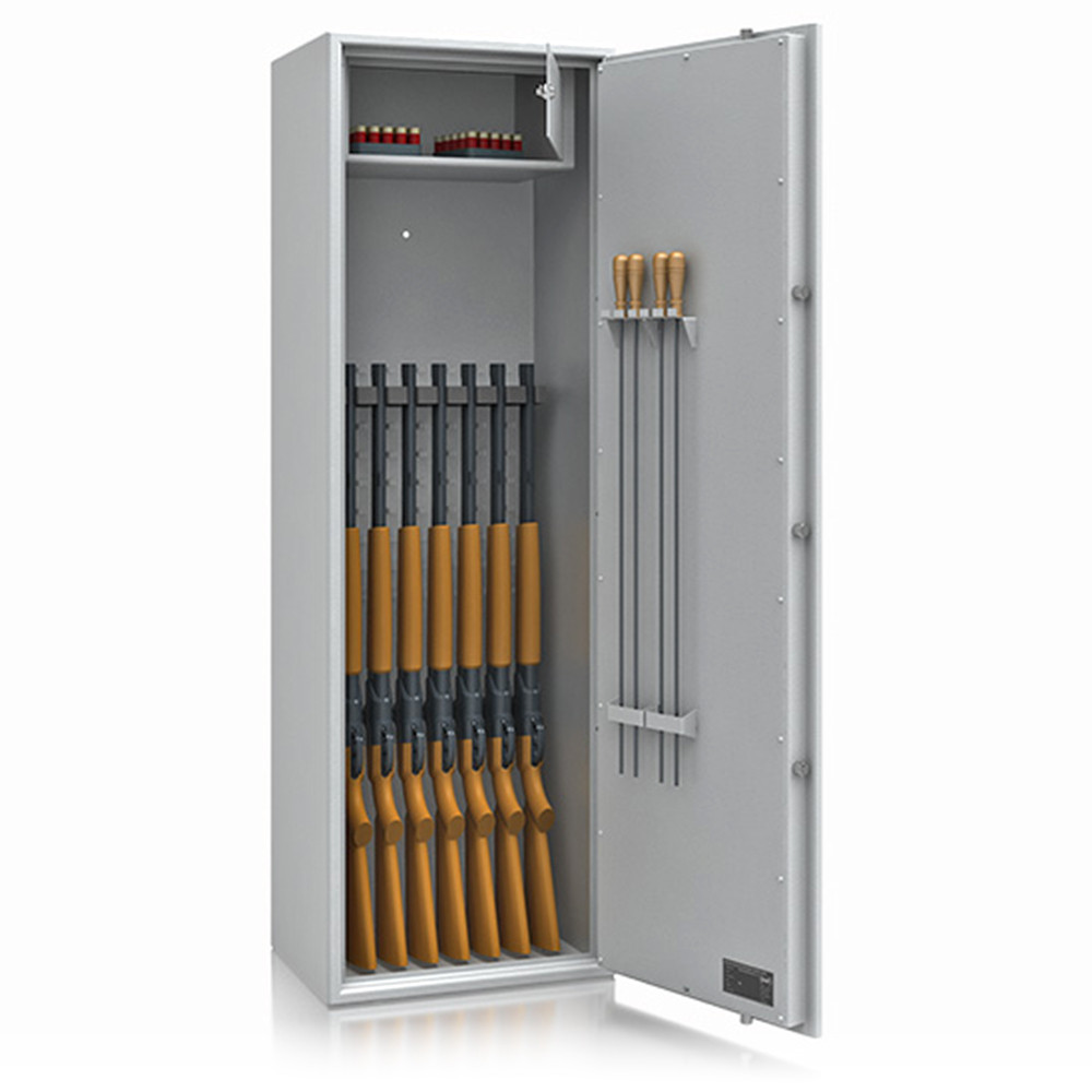 • 3 mm-es, szimplafalú acél test• 60 mm vastag, triplafalú ajtó (20 mm-es erősítéssel)• 180 fokos ajtónyitás, erősített külső zsanérokkal• háromirányú zárás, 20 mm-es kerek, acél hevederekkel• felfúrás ellen mangán acéllappal védett zárszerkezet• külön zárható lőszertartó (lecsavarozható), 3 mm-es acél ajtóval, cilinderzárral, kettő darab kulccsal (180 mm magas, 260 mm mély)• szivacs fegyvertartók 5, 6, 8 vagy 10 db fegyver részére (magassága állítható)• ajtóra szerelt tisztítóvessző tartó• két darab 10mm-es rögzítő furat lefelé és hátrafelé• zöld (RAL 6020) vagy szürke (RAL 7035) színben