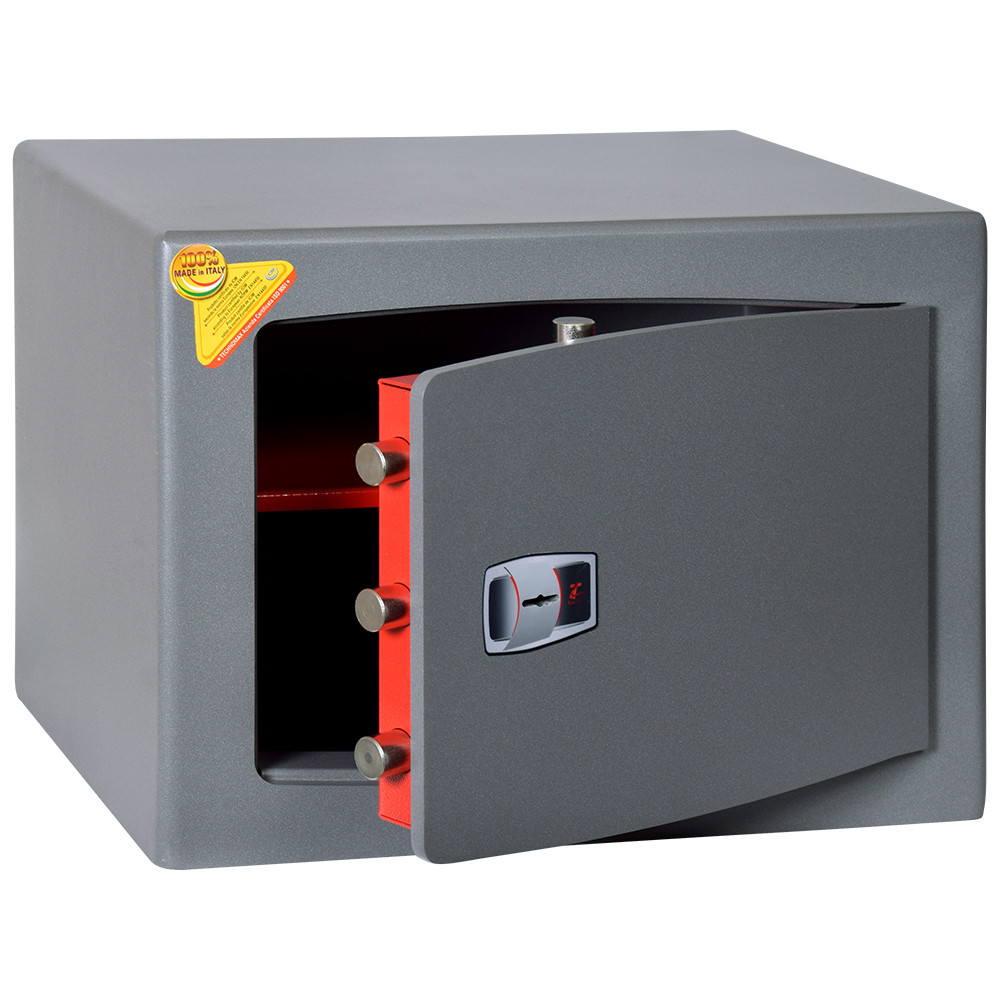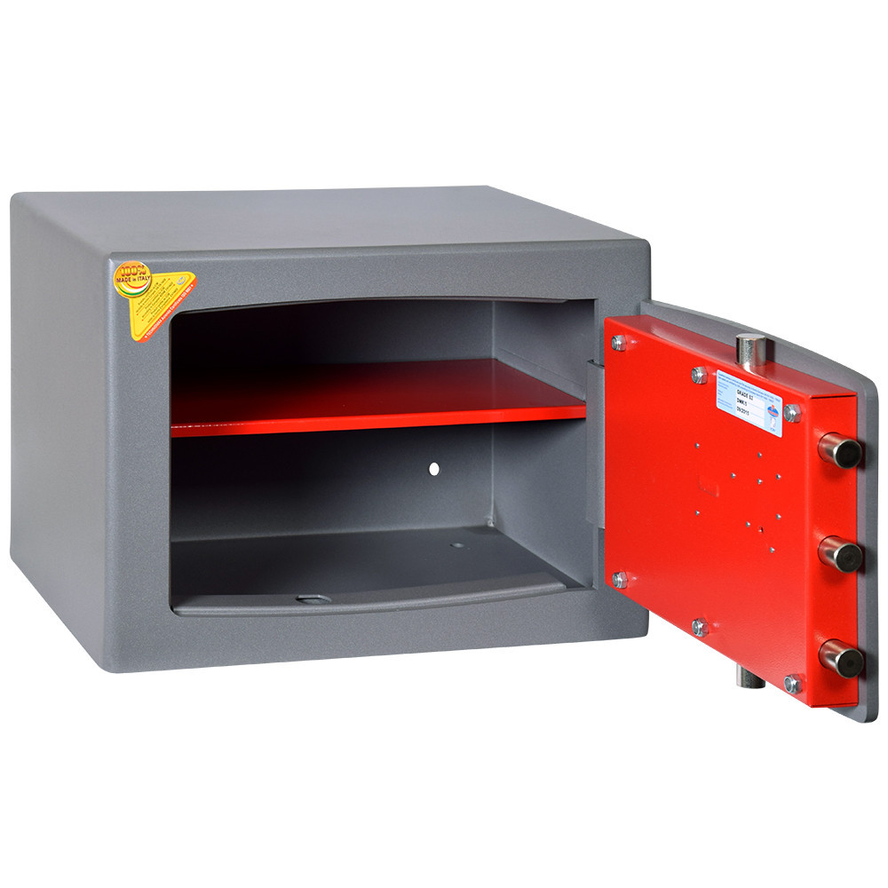 • 5 mm-es trezor test megerősített 10 mm-es előlappal• 10 mm-es lézervágott edzett acél ajtó• 90 fokos ajtónyitás rejtett zsanérokkal• egyirányú (DMK 3) vagy háromirányú (DMK 4-től) zárás 22 mm-es kerek acél hevederekkel• felfúrás ellen mangán acéllappal védett zárszerkezet• 8 lamellás duplatollú biztonsági zár, kettő darab kulccsal• kivehető polc (magassága nem állítható)• 12 mm-es rögzítő furatok hátrafelé és lefelé• elegáns metálezüst színben