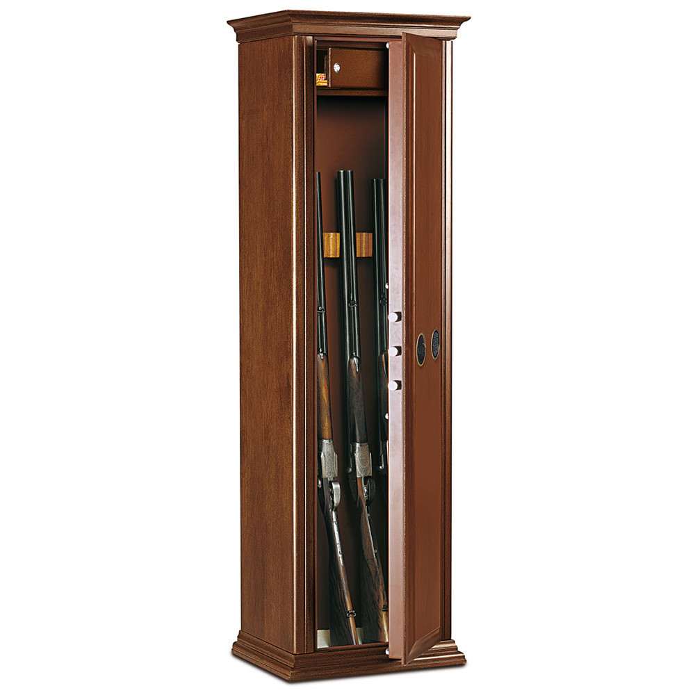 •faborítású fegyverszekrény•elegáns dió színű tömörfa bevonattal•3 mm-es szimplafalú acél test•duplafalú ajtó, 5 mm-es acél borítással•90 fokos ajtónyitás rejtett zsanérokkal•háromirányú zárás, 22 mm-es acél hevederrel•mangán acéllappal védett zárszerkezet•elektronikus számkombinációs zár•süllyesztett billentyűzet és kilincs•manipuláció elleni védelem•külön zárható lőszertartó, cilinderzárral, két kulccsal•festett tömörfa fegyvertartók•alul kárpit borítás•rögzítő furat lefelé és hátrafelé