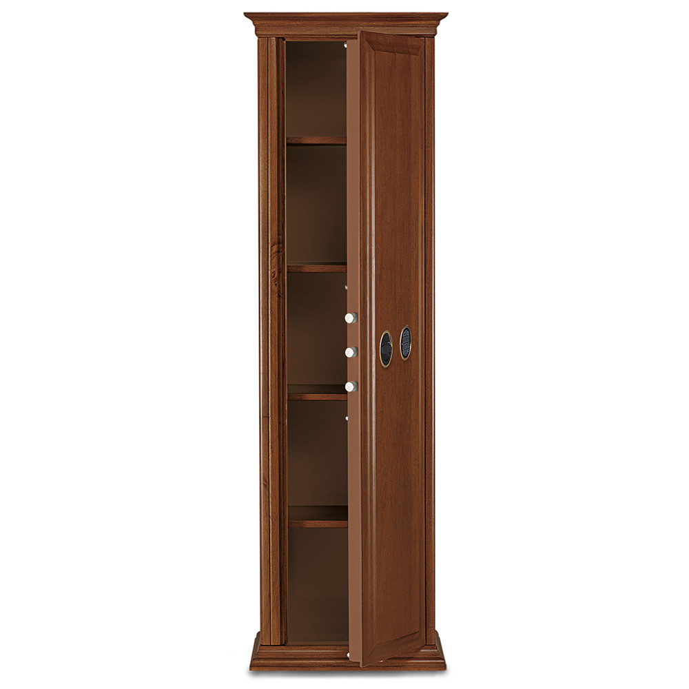 •faborítású fegyverszekrény•lőszer, maroklőfegyver tárolására•elegáns dió színű tömörfa bevonattal•3 mm-es szimplafalú acél test•duplafalú ajtó, 5 mm-es acél borítással•90 fokos ajtónyitás rejtett zsanérokkal•háromirányú zárás, 22 mm-es acél hevederrel•mangán acéllappal védett zárszerkezet•elektronikus számkombinációs zár•süllyesztett billentyűzet és kilincs•manipuláció elleni védelem•négy darab tömörfa polc•alul kárpit borítás•rögzítő furat lefelé és hátrafelé