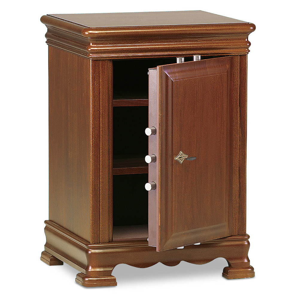 • faborítású fegyverszekrény • lőszer, maroklőfegyver tárolására • elegáns dió színű tömörfa bevonattal • 4 mm-es acél test, megerősített előlappal • 8 mm-es lézervágott edzett acél ajtó • 90 fokos ajtónyitás rejtett zsanérokkal • háromirányú zárás, 22 mm-es acél hevederrel • mangán acéllappal védett zárszerkezet • 8 lamellás duplatollú biztonsági zár • kettő darab kulccsal, kódkártyával • két darab tömörfa polc • alul kárpit borítás • rögzítő furat lefelé és hátrafelé