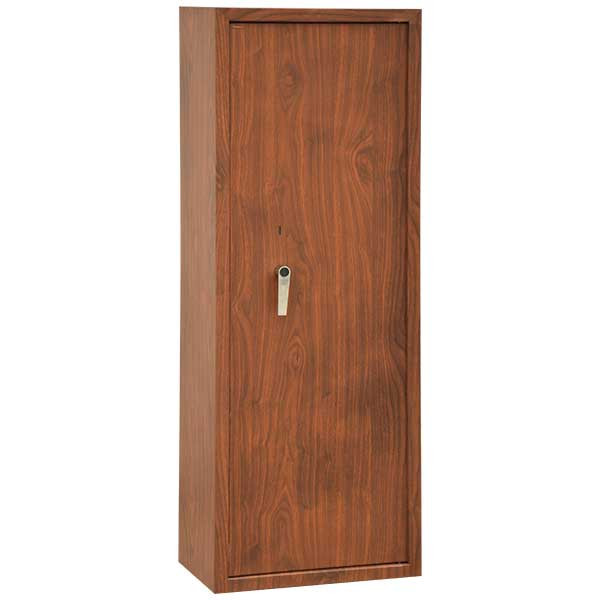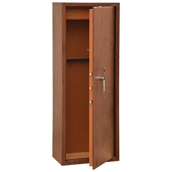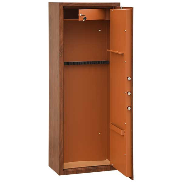 • rendőrség és biztosítók által elfogadott fegyverszekrény• 2 mm-es szimplafalú acél test• 55 mm vastag duplafalú ajtó, 2 mm-es acél borítással• 90 fokos ajtónyitás erős jobboldali zsanérokkal• háromirányú zárás, 5 db 22 mm-es kerek, acél hevederrel• 6 lamellás duplatollú biztonsági zár, kettő darab kulccsal• 150 mm magas, külön zárható lőszertartó• szivacs fegyvertartók 4, 5 vagy 10 db fegyver részére• festett bézs színű fegyverszekrény belső• erezett cseresznyefa utánzatú (fóliázott) külső• rögzítő furat lefelé és hátrafelé