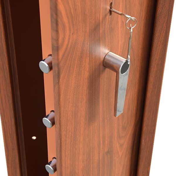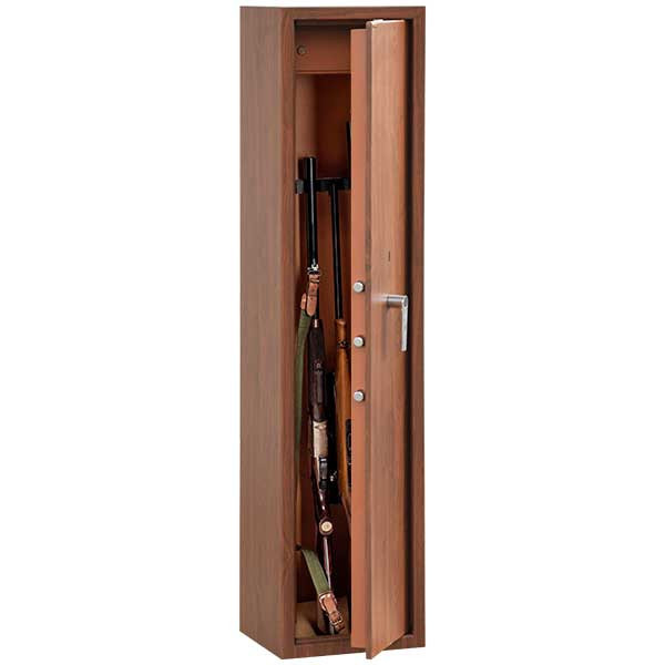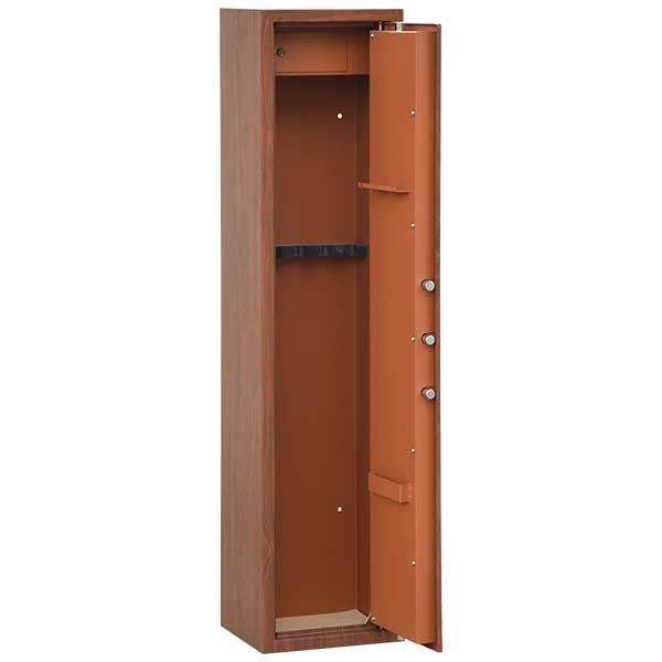 • rendőrség és biztosítók által elfogadott fegyverszekrény • 2 mm-es szimplafalú acél test • 55 mm vastag duplafalú ajtó, 2 mm-es acél borítással • 90 fokos ajtónyitás erős jobboldali zsanérokkal • háromirányú zárás, 5 db 22 mm-es kerek, acél hevederrel • 6 lamellás duplatollú biztonsági zár, kettő darab kulccsal • 150 mm magas, külön zárható lőszertartó • szivacs fegyvertartók 4, 5 vagy 10 db fegyver részére • festett bézs színű fegyverszekrény belső • erezett cseresznyefa utánzatú (fóliázott) külső • rögzítő furat lefelé és hátrafelé
