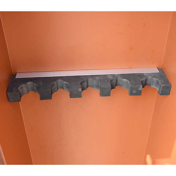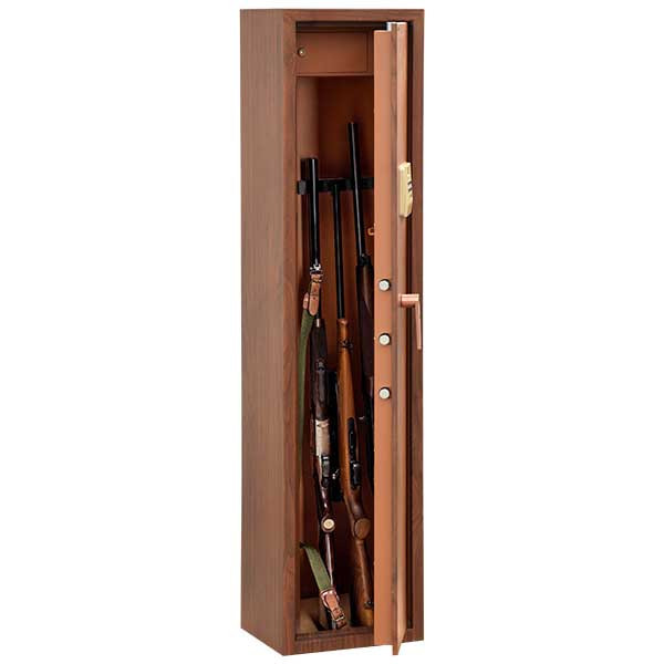• rendőrség és biztosítók által elfogadott fegyverszekrény • 2 mm-es szimplafalú acél test • 55 mm vastag duplafalú ajtó, 2 mm-es acél borítással • 90 fokos ajtónyitás erős jobboldali zsanérokkal • háromirányú zárás, 5 db 22 mm-es kerek, acél hevederrel • elektronikus számkombinációs zár • műanyag billentyűzet, LCD kijelző, belső elemtartó • 1 és 8 számjegy közötti felhasználói kód • mechanikus vésznyitási lehetőség körkulccsal • zár 4 db Mignon LR 6 AA 1,5V elemmel működik • 150 mm magas, külön zárható lőszertartó • szivacs fegyvertartók 5 vagy 10 db fegyver részére • festett bézs színű fegyverszekrény belső • erezett cseresznyefa utánzatú (fóliázott) külső • rögzítő furat lefelé és hátrafelé