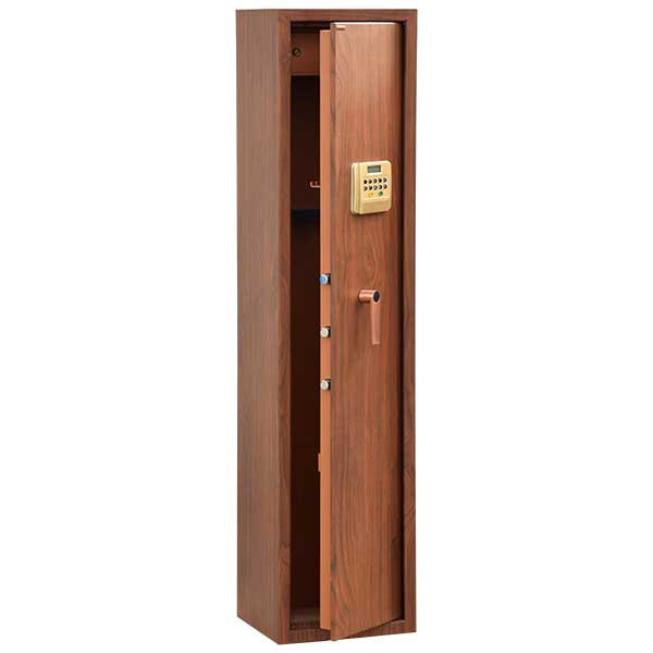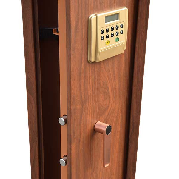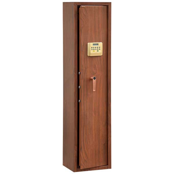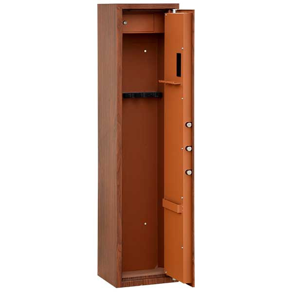 • rendőrség és biztosítók által elfogadott fegyverszekrény• 2 mm-es szimplafalú acél test• 55 mm vastag duplafalú ajtó, 2 mm-es acél borítással• 90 fokos ajtónyitás erős jobboldali zsanérokkal• háromirányú zárás, 5 db 22 mm-es kerek, acél hevederrel• elektronikus számkombinációs zár• műanyag billentyűzet, LCD kijelző, belső elemtartó• 1 és 8 számjegy közötti felhasználói kód• mechanikus vésznyitási lehetőség körkulccsal• zár 4 db Mignon LR 6 AA 1,5V elemmel működik• 150 mm magas, külön zárható lőszertartó• szivacs fegyvertartók 5 vagy 10 db fegyver részére• festett bézs színű fegyverszekrény belső• erezett cseresznyefa utánzatú (fóliázott) külső• rögzítő furat lefelé és hátrafelé