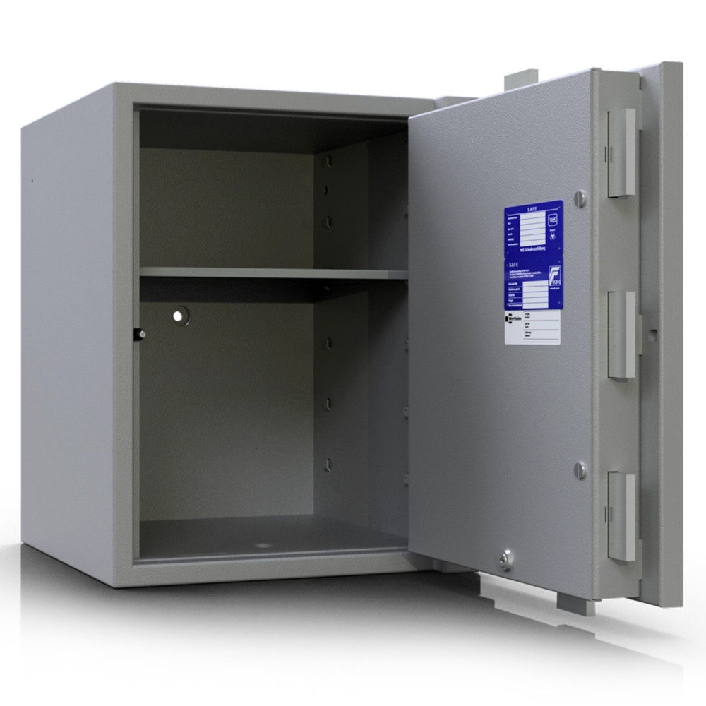 • DIN 4102 szerinti tűzálló szigetelés • többrétegű acél test (vékonyított a maximális térfogatért) • 80 mm vastag, többrétegű acél ajtó (szervizkulcsos) • 25 mm-es speciálisan megerősített beton töltet a testben és az ajtóban (lángvágás és flexelés ellen) • 25 mm-re kiemelkedő csillag alakú kilincs és zsanér • 180 fokos ajtónyitás, erős külső zsanérokkal • testbe forduló ajtó (zsanérlevágás ellen) • háromirányú zárás tömör acél hevederekkel • rozsdamentes belső szerkezet és kilincsmű (werk) • mangán acéllappal védett zárszerkezet (fúrás ellen) • rugós, műanyag huzalos passzív zár (felfúrásra, átvágásra és zárbeütésre is aktiválódik) • huzal elszakadása után a páncélszekrény nem nyitható • kisebb tüzek elleni védelem a testben és az ajtóban • kivehető és állítható magasságú polc(ok) • 14 mm-es rögzítő furat lefelé és hátrafelé • alapkivitelben kulcsos zárral, középszürke színben • többféle zárral, jobbos és balos ajtónyitással is rendelhető • prémium kategóriájú páncélszekrény igényeseknek