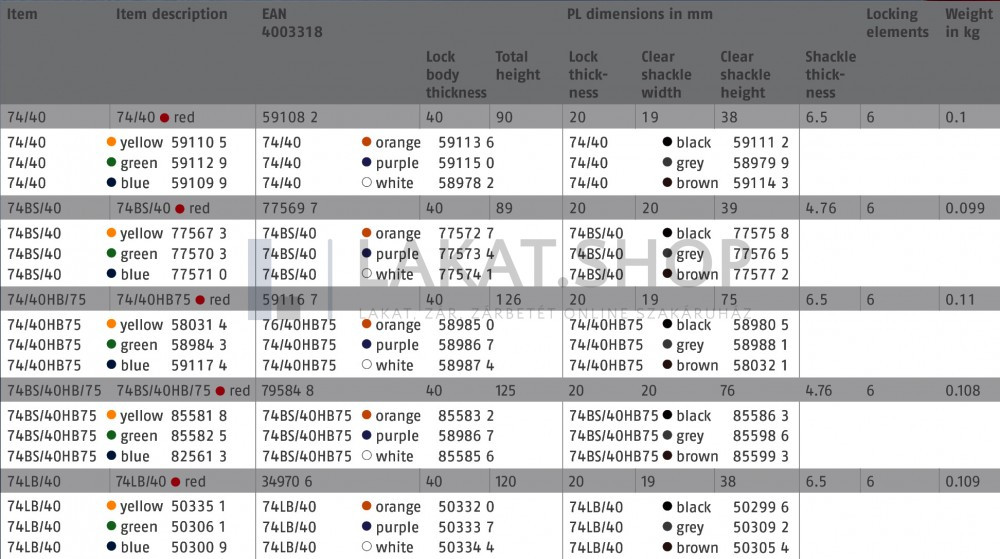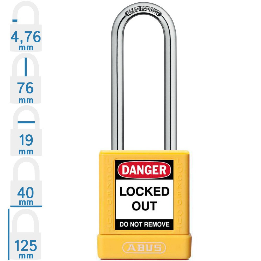 ABUS 74BS/40HB75 LOTO munkavédelmi kizáró lakat (méret: lásd a képen): speciális ötvözetű Abus lakat kétoldali golyós reteszeléssel. Acél kengyel, 20 mm-es lakat test mélység. Az ABUS 74BS/40HB75 LOTO munkavédelmi kizáró lakat 10 különböző színben rendelhető! Minőségi ABUS zárszerkezet, 1 db kulcs/lakat. A kép illusztráció, a valóságtól minimálisan eltérhet.