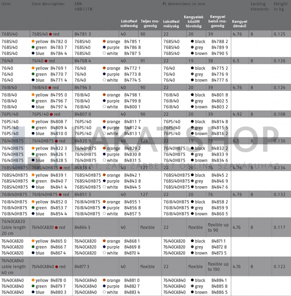 ABUS 76BS/40HB75 LOTO munkavédelmi kizáró lakat (méret: lásd a képen): speciális ötvözetű Abus lakat, acél kengyellel, kétoldali golyós reteszeléssel. Az ABUS 76BS/40HB75 LOTO munkavédelmi kizáró lakat 10 különböző színben rendelhető! Minőségi ABUS zárbetét, 1 db kulcs/lakat. A lakat test mélysége: 22 mm.